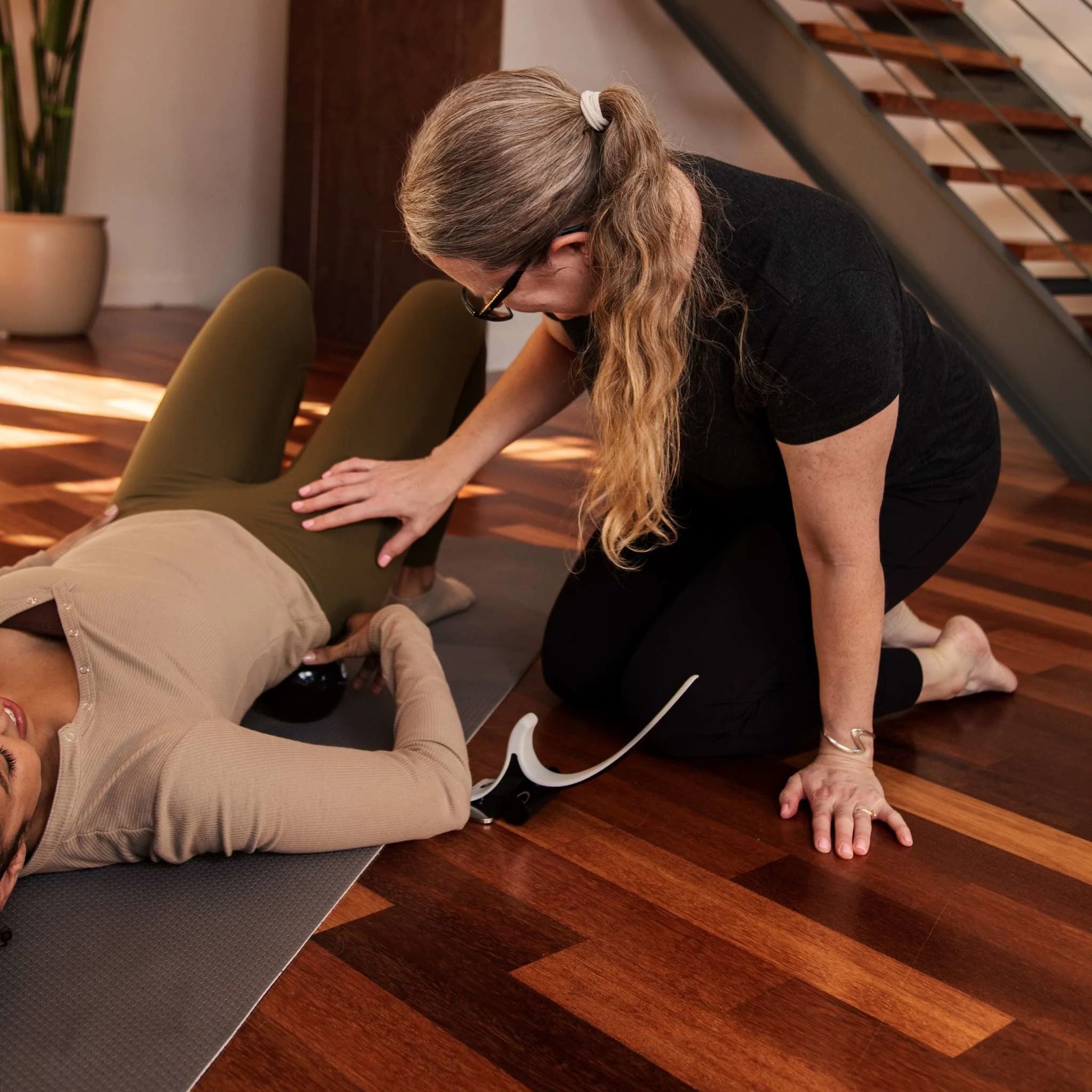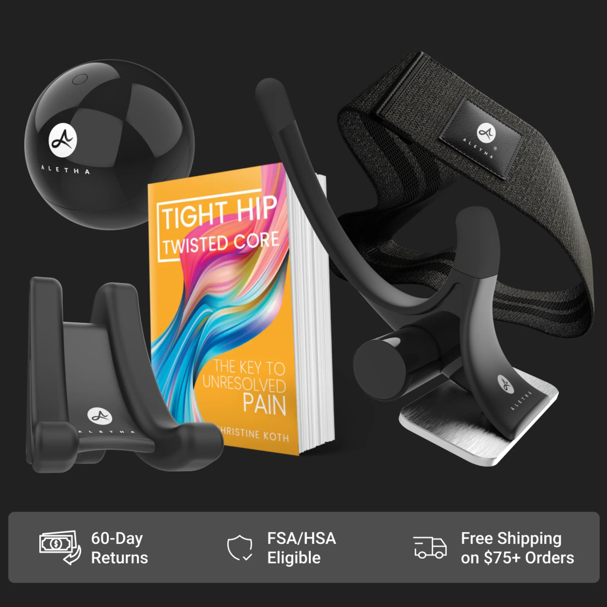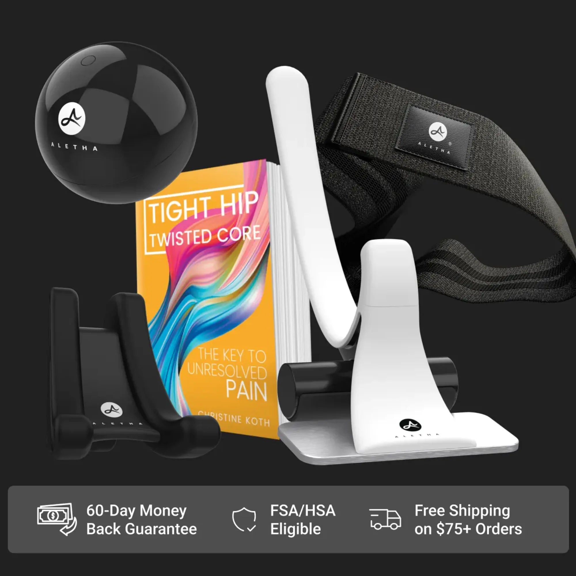 The Set works in sequence. Release the deep hip muscles with the Hip Hook and Orbit. Release the upper body tension drivers with the Range. Strengthen and stabilize with the Band. Understand the full picture with the book. Every tool has a specific job, and together they address what most approaches leave behind.