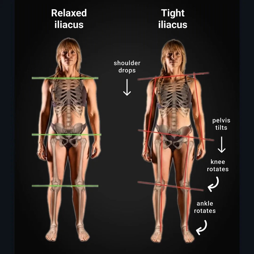 When the iliacus, psoas, and hip rotators like the piriformis are tight, it tips and twists the pelvis and creates a ripple effect of pain and alignment issues through the hips, spine, and lower body.