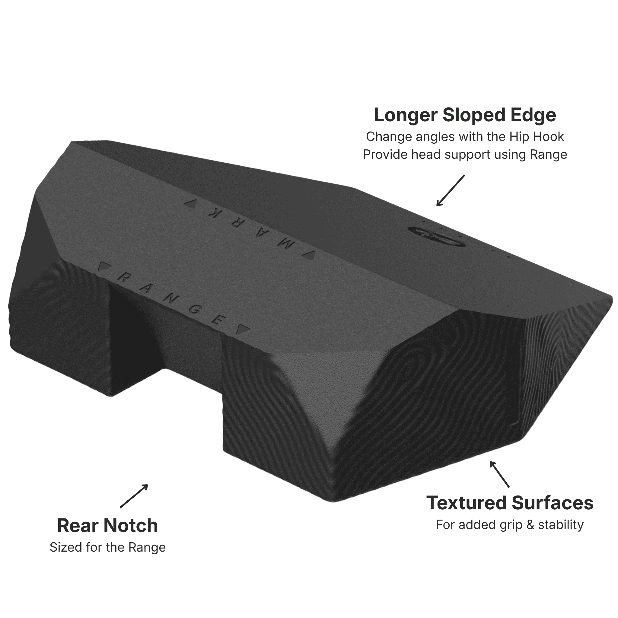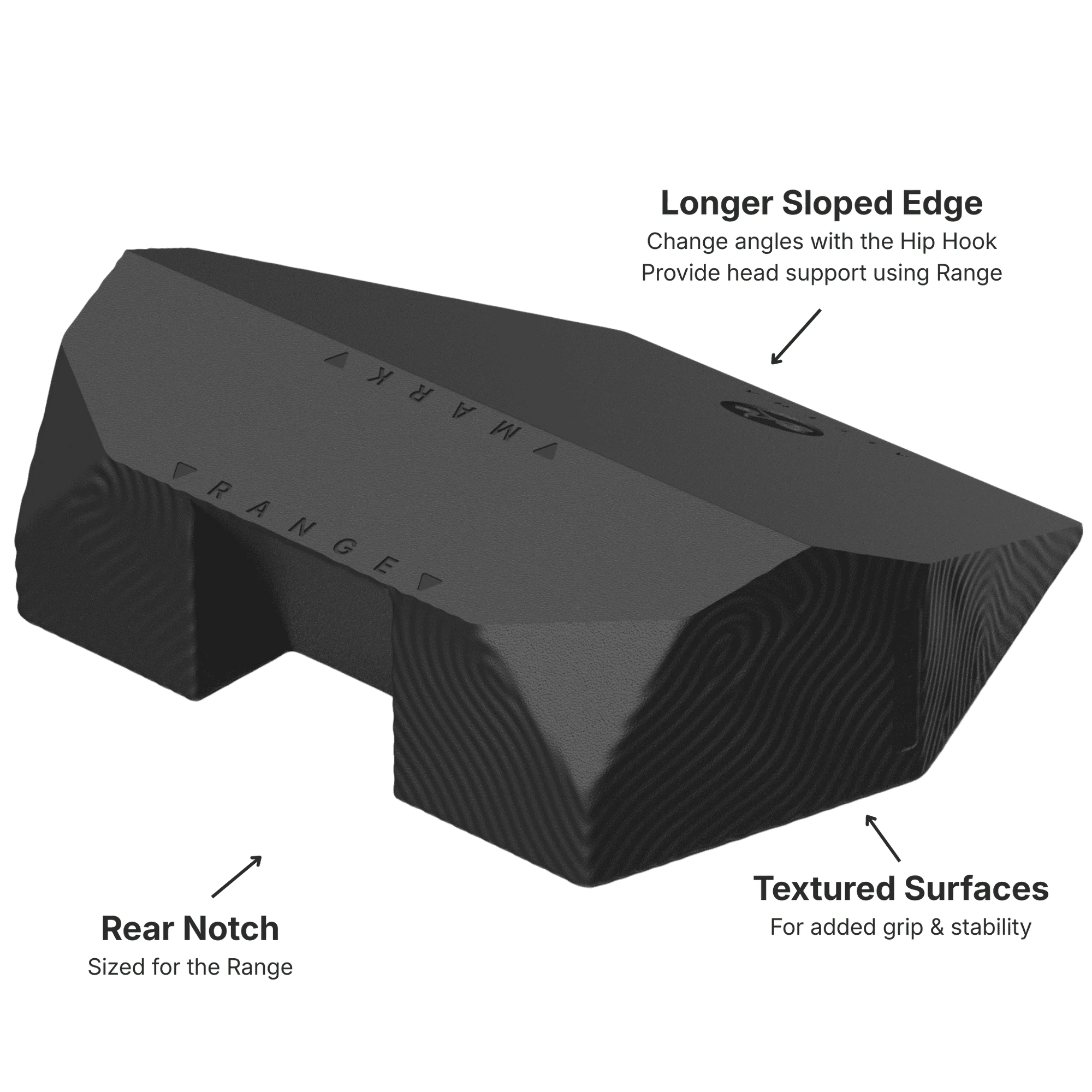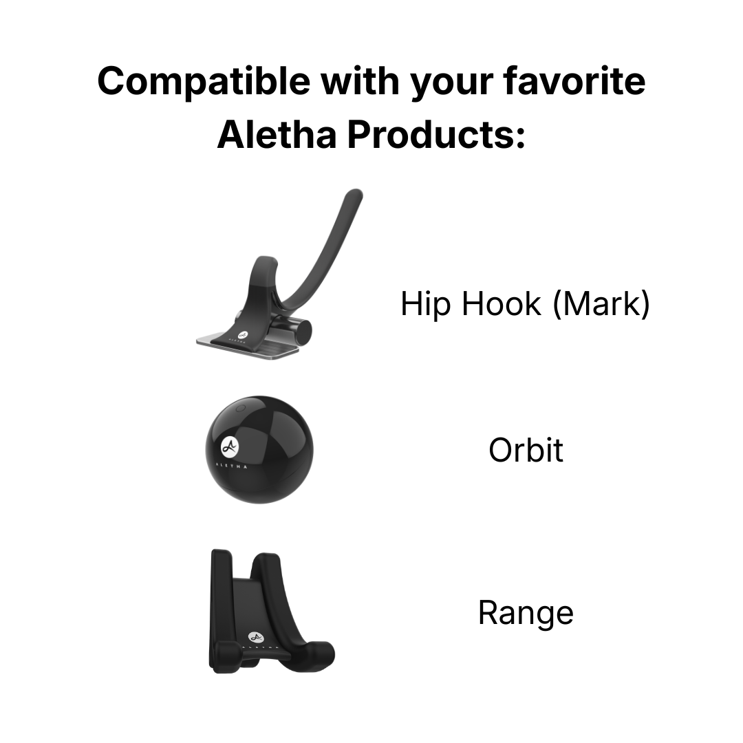 The Aletha Wedge is a precision accessory designed by a physical therapist specifically around the Hip Hook (Mark), Range, and Orbit. Its asymmetric geometry, longer sloped edge, rear notch, and textured grip surfaces aren’t generic foam block features each one solves a specific positioning problem that users of these tools encounter.