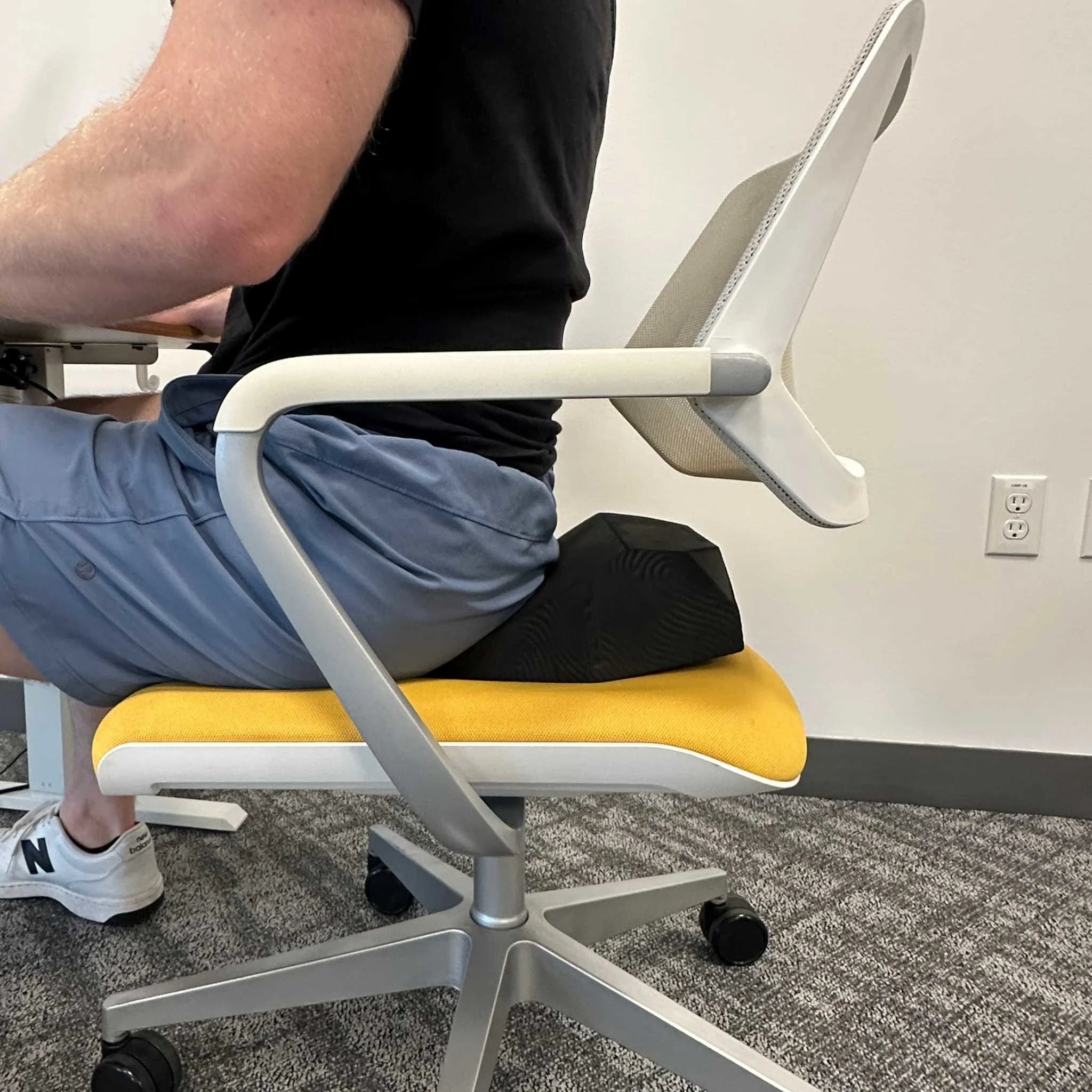 - Seated posture support at your desk — the slope encourages a natural lumbar curve and reduces demand on your hip flexors throughout the day